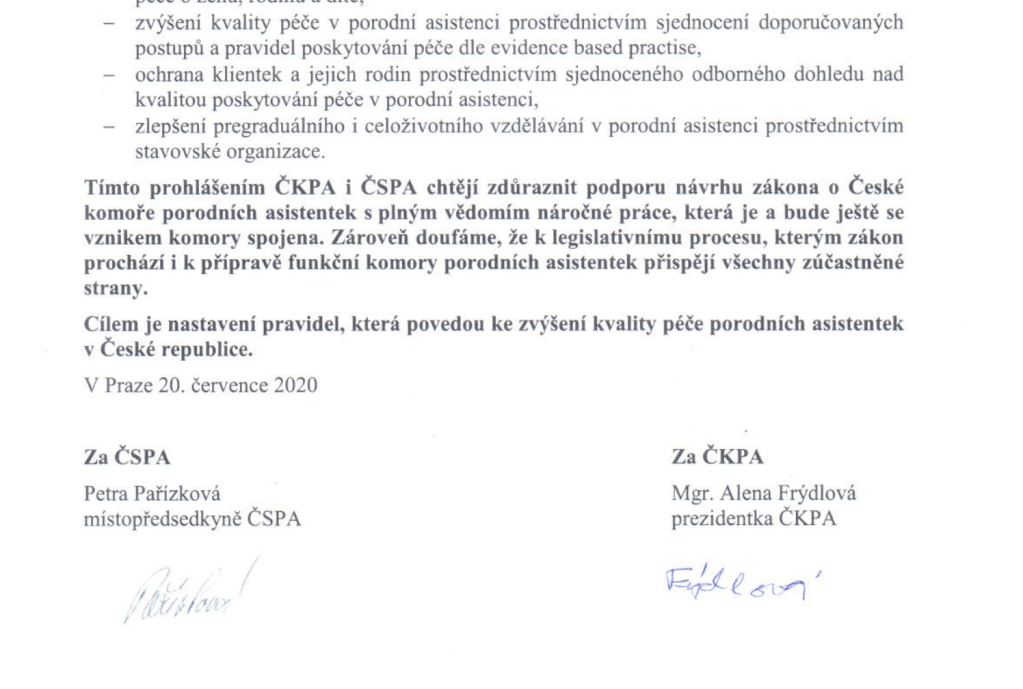 ,,Zástupkyně ČKPA, UNIPA a ČSPA nadále spolupracují se senátorem Lumírem Kantorem na přípravě zákona o České komoře porodních asistentek. Senátor Kantor a další senátoři předložili návrh zákona v Senátu ČR dne 30.1.2020 (více ZDE). K návrhu zákona však měly profesní organizace i další zúčastněné strany řadu připomínek. Proto senátor Kantor stáhnul návrh zákona z projednávání v Senátu a v tuto chvíli se na základě připomínek upravuje. ČKPA i nadále pracuje na těchto změnách a podílí se na dotvoření stavovských předpisů. ČKPA podporuje vytvoření zákona, který pomůže regulovat profesi porodní asistentky a přispěje ke zkvalitnění poskytované péče ženám.
