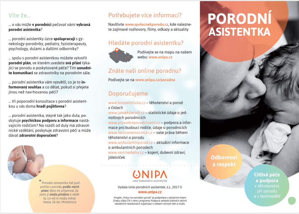 Pěkný informační leták o roli porodní asistentky vydala Unie porodních asistentek: https://www.unipa.cz/wp-content/uploads/2018/05/letak_PA_skladacka.pdf