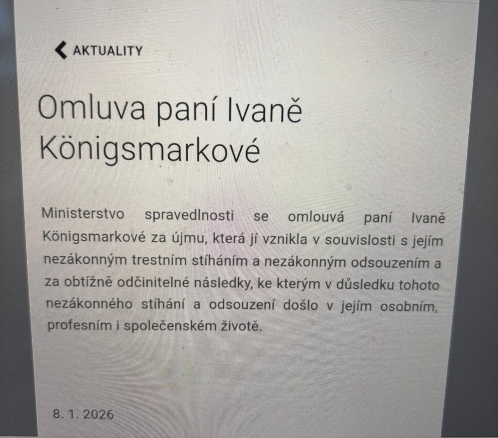 “Apology to Mrs. Königsmarkova: The Ministry of Justice would like to apologise to Mrs Ivana Königsmarkova for all the damage caused by the unlawful criminal proceedings and unlawful sentencing and for the hard-to-mitigate consequences she suffered in her personal, professional and social life in the aftermath of the unlawful proceedings and sentencing.”
