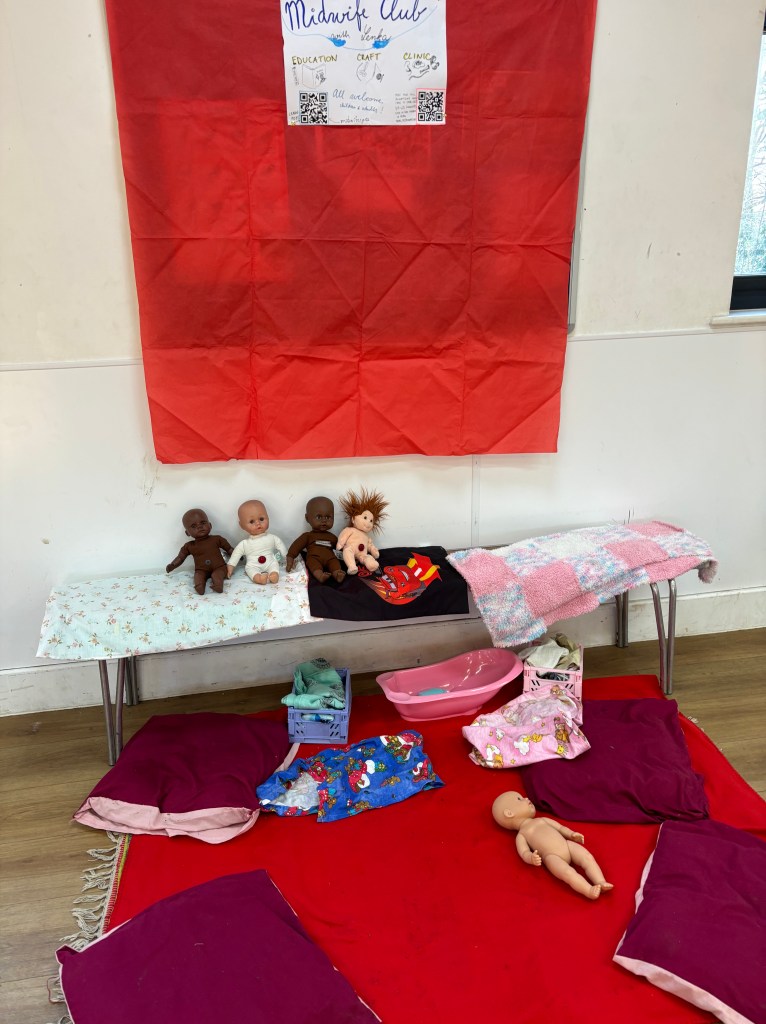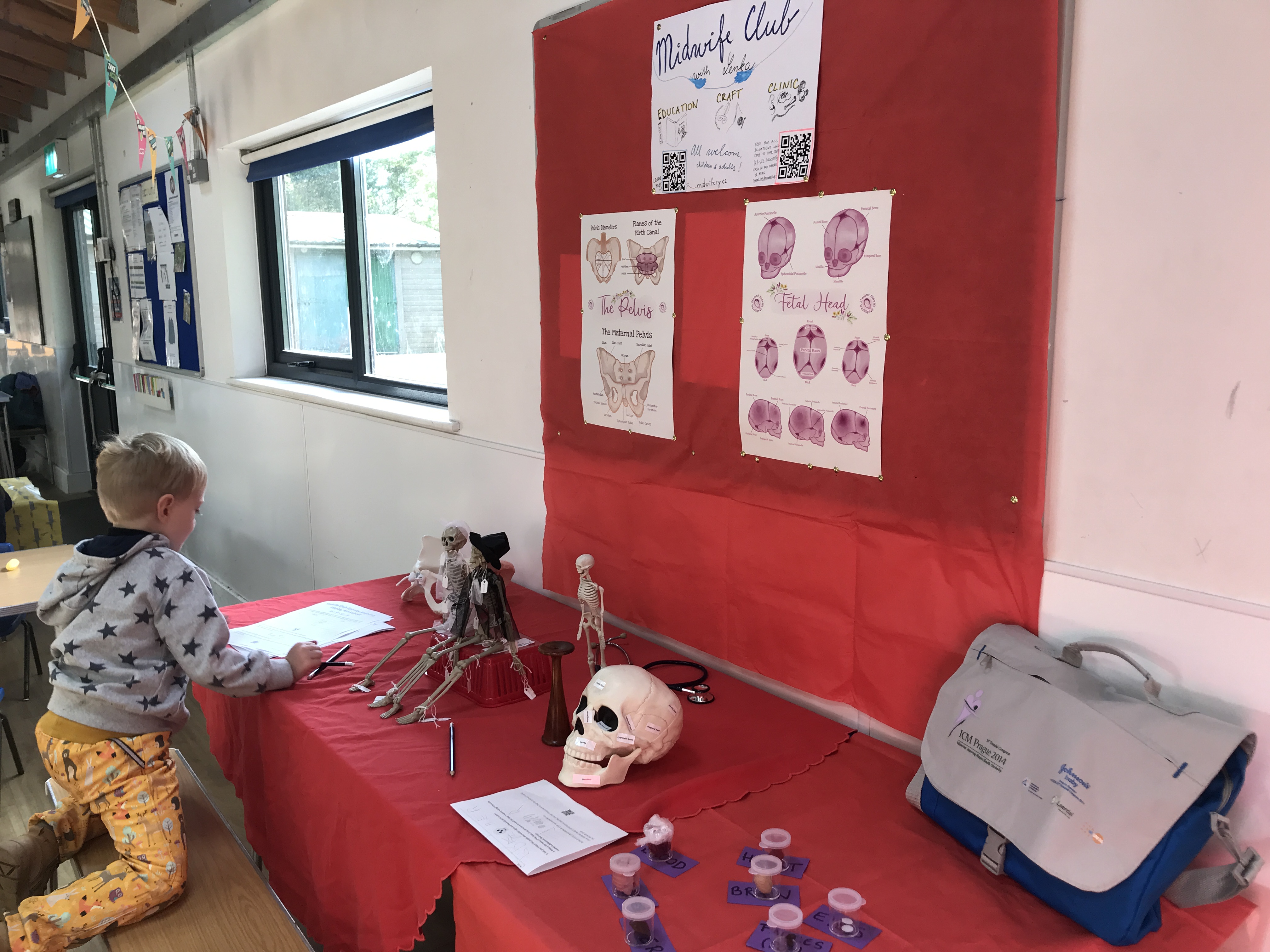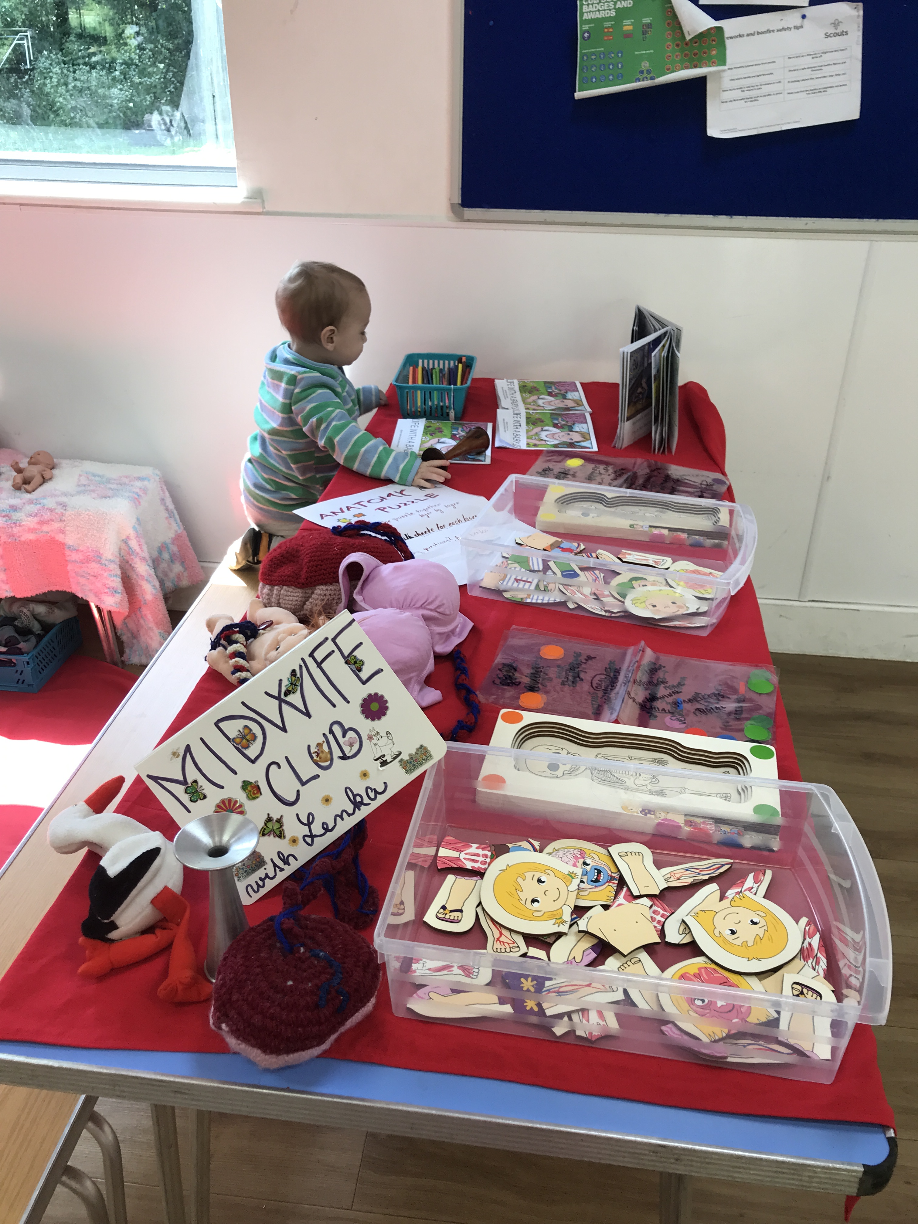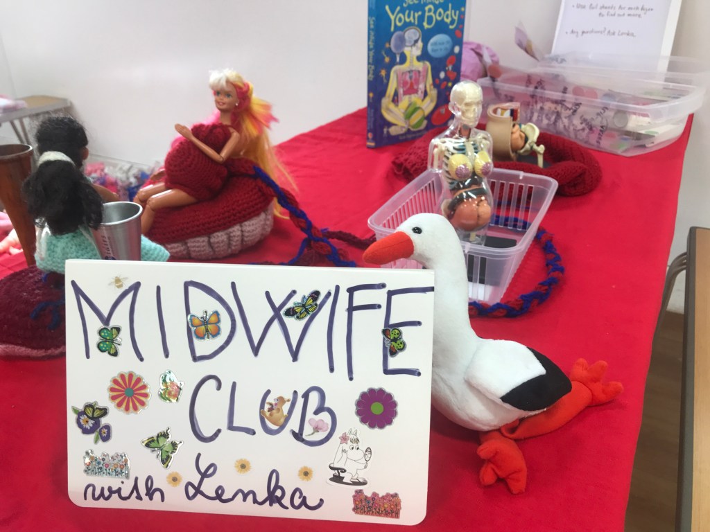 The Midwife Club is a table with activities and a relaxation and play zone for children and babies, often with relaxing music. The purpose is to explore and learn about pregnancy, childbirth, babies, breastfeeding, human body and more in a safe environment in a positive, playful and child-led way.