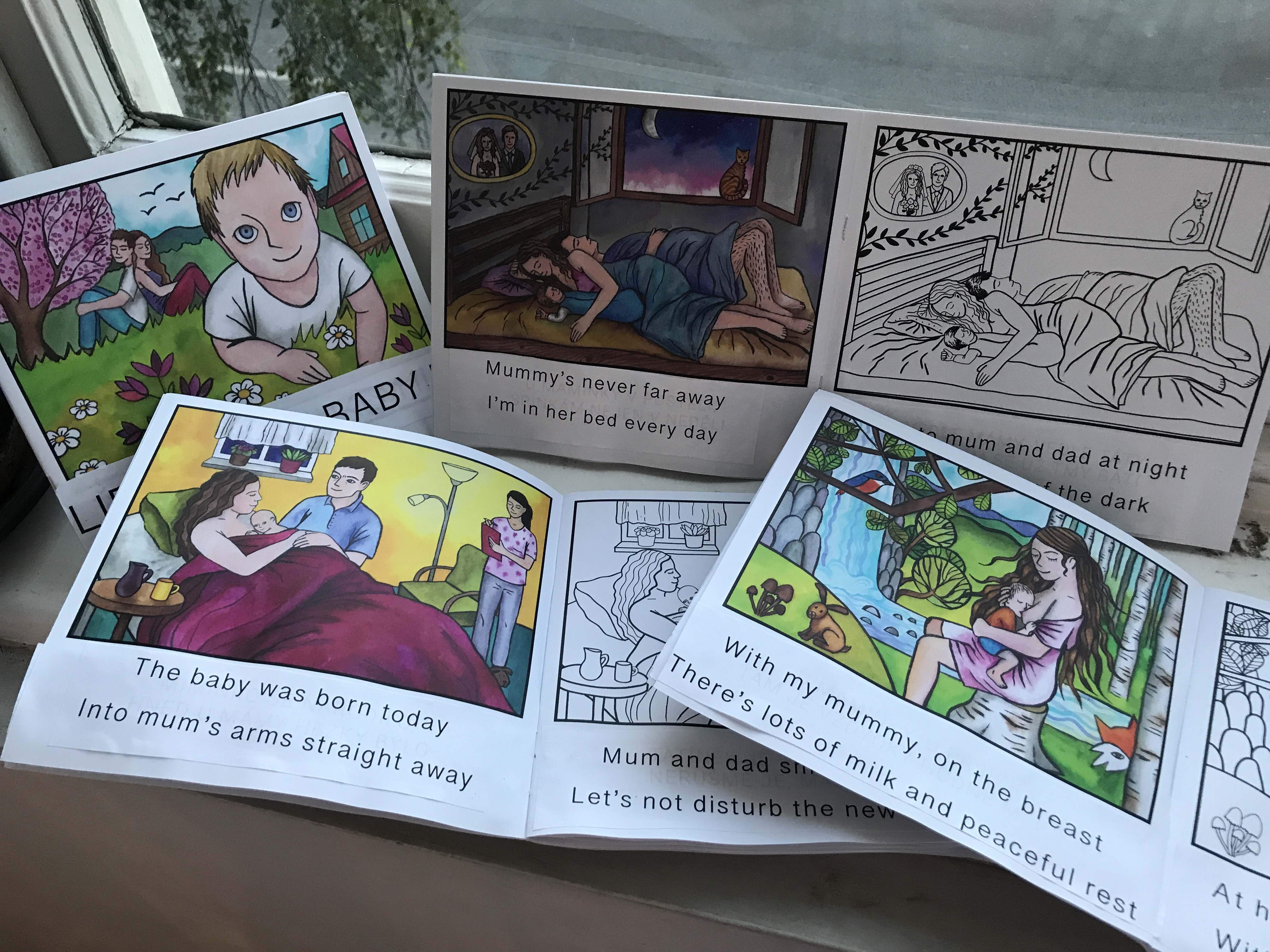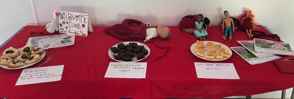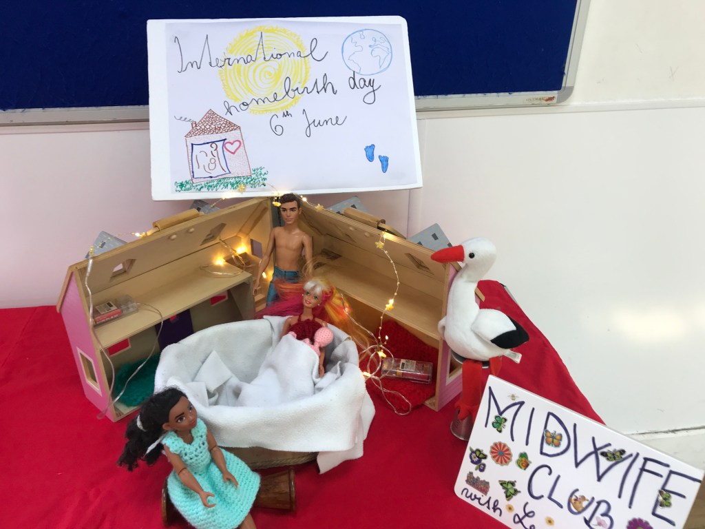 - 02/06/23 Homebirth display to celebrate International Homebirth Day. Life with a baby books. Womb, baby and placenta. Dolls, prams, clothes, slings, nappies.