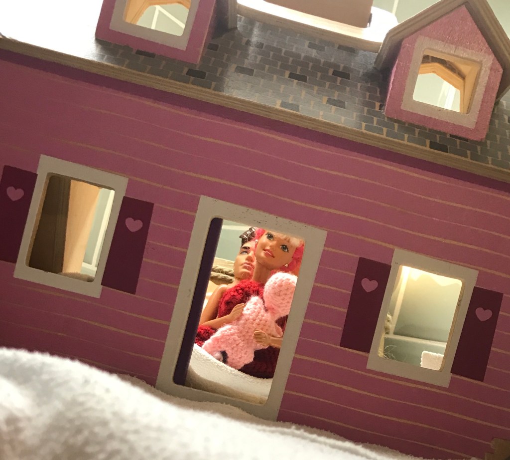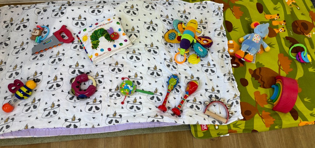 09/02/24 Baby Zone, Life With a Baby colour in books. A doll family to play with. Baby in womb to explore and play with. Cross stitch project week 4.