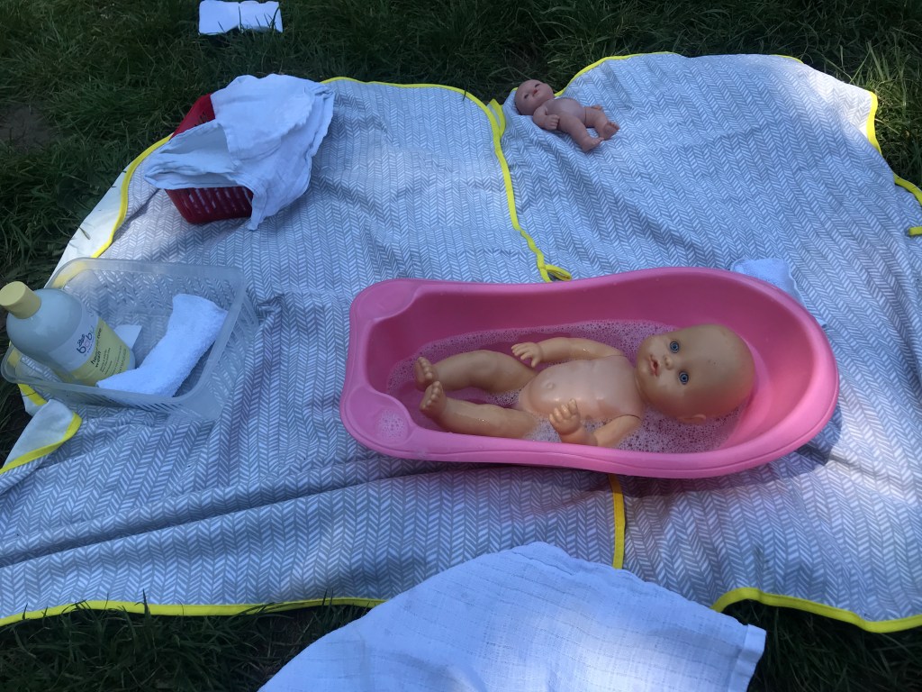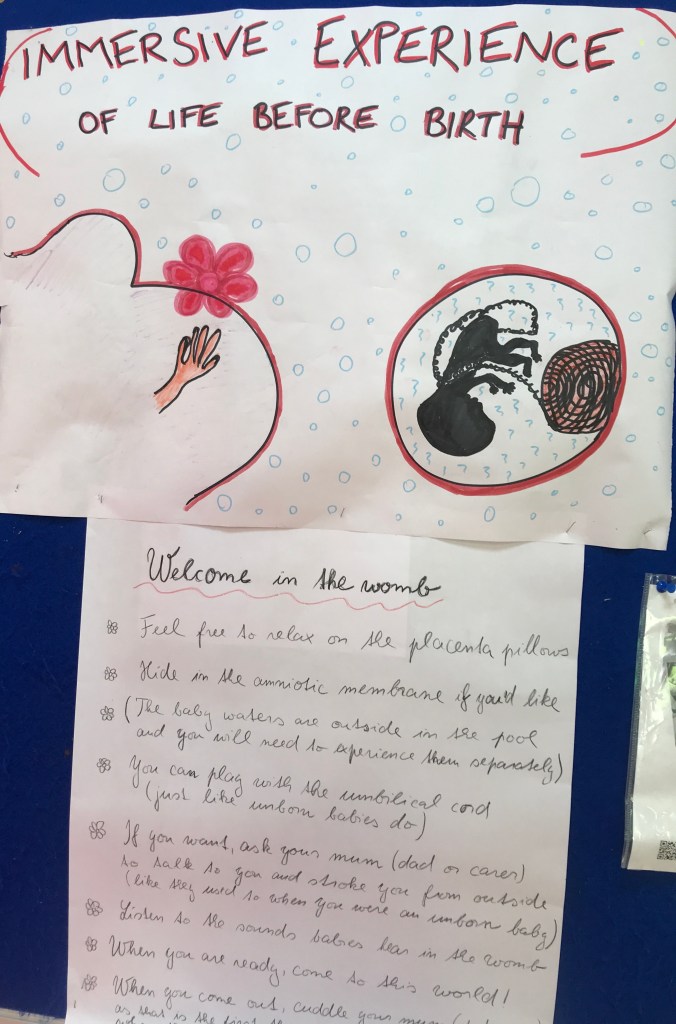 - 23/06/23 Immersive experience of life before birth – womb to hide in and relax on placenta pillow, wrapped in amniotic blanket, listening to womb sounds. Refreshing baby waters immersion in outside paddling pool 🙂