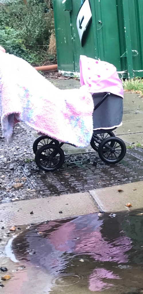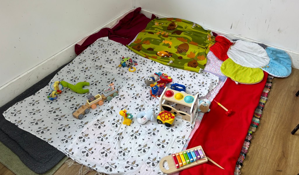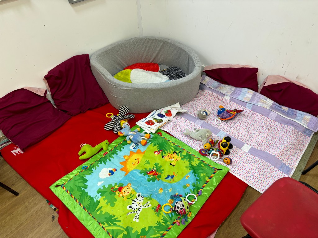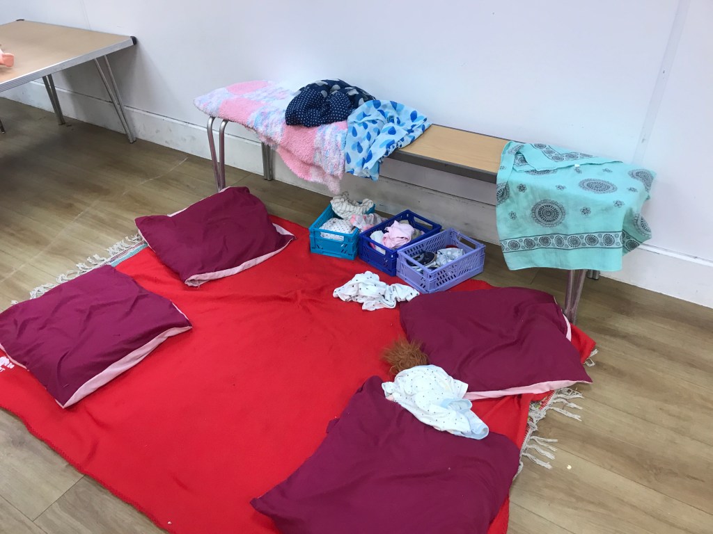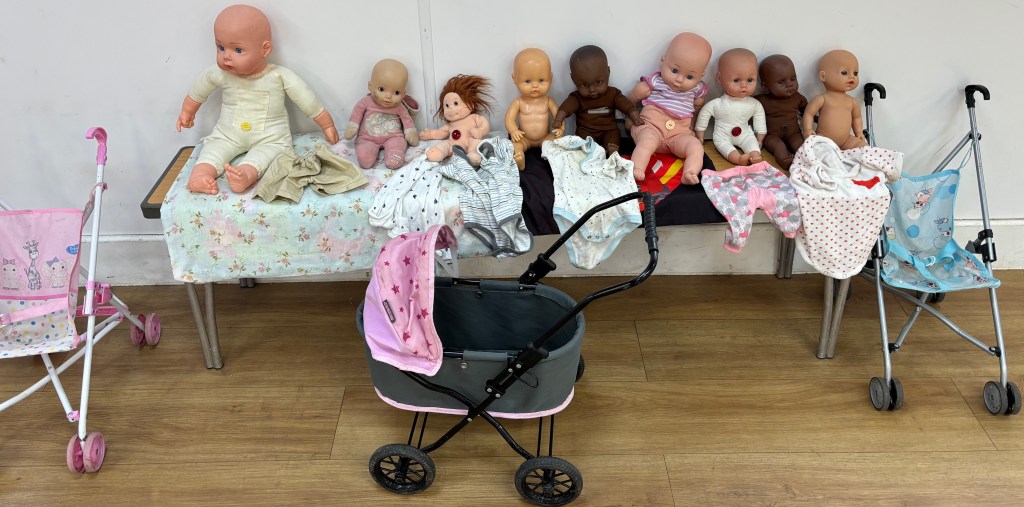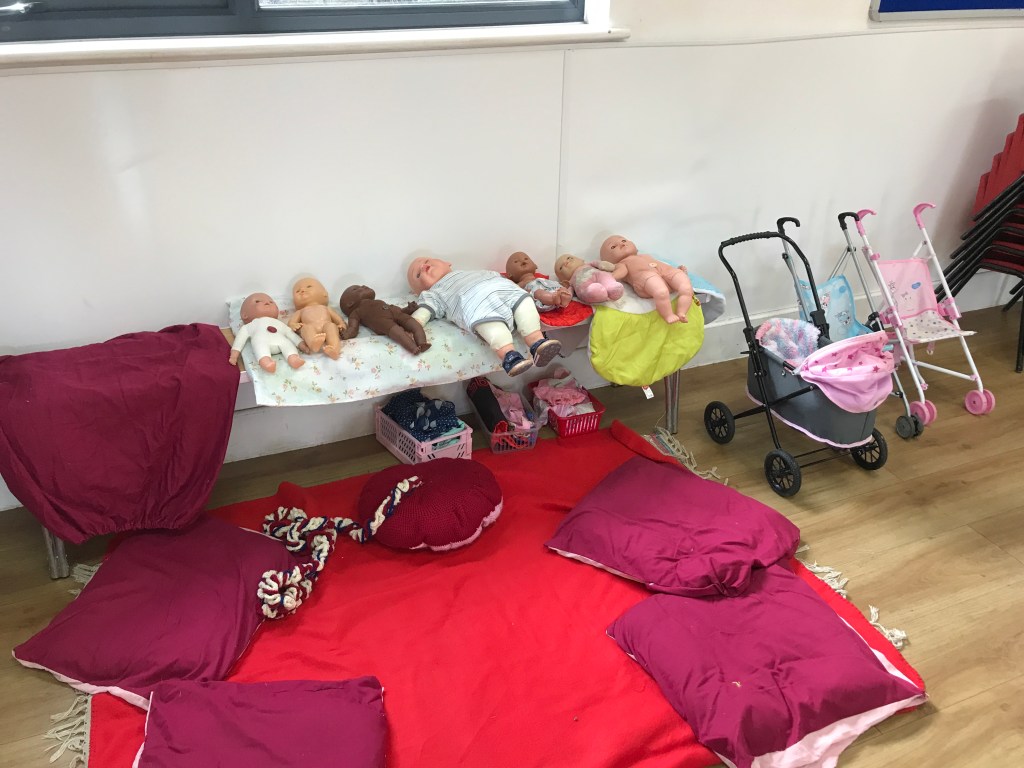 - 19/01/2024 Play and relaxation zone with dolls, accessories and prams. Baby Zone. Week One of Cross Stitch Project at the main craft table.