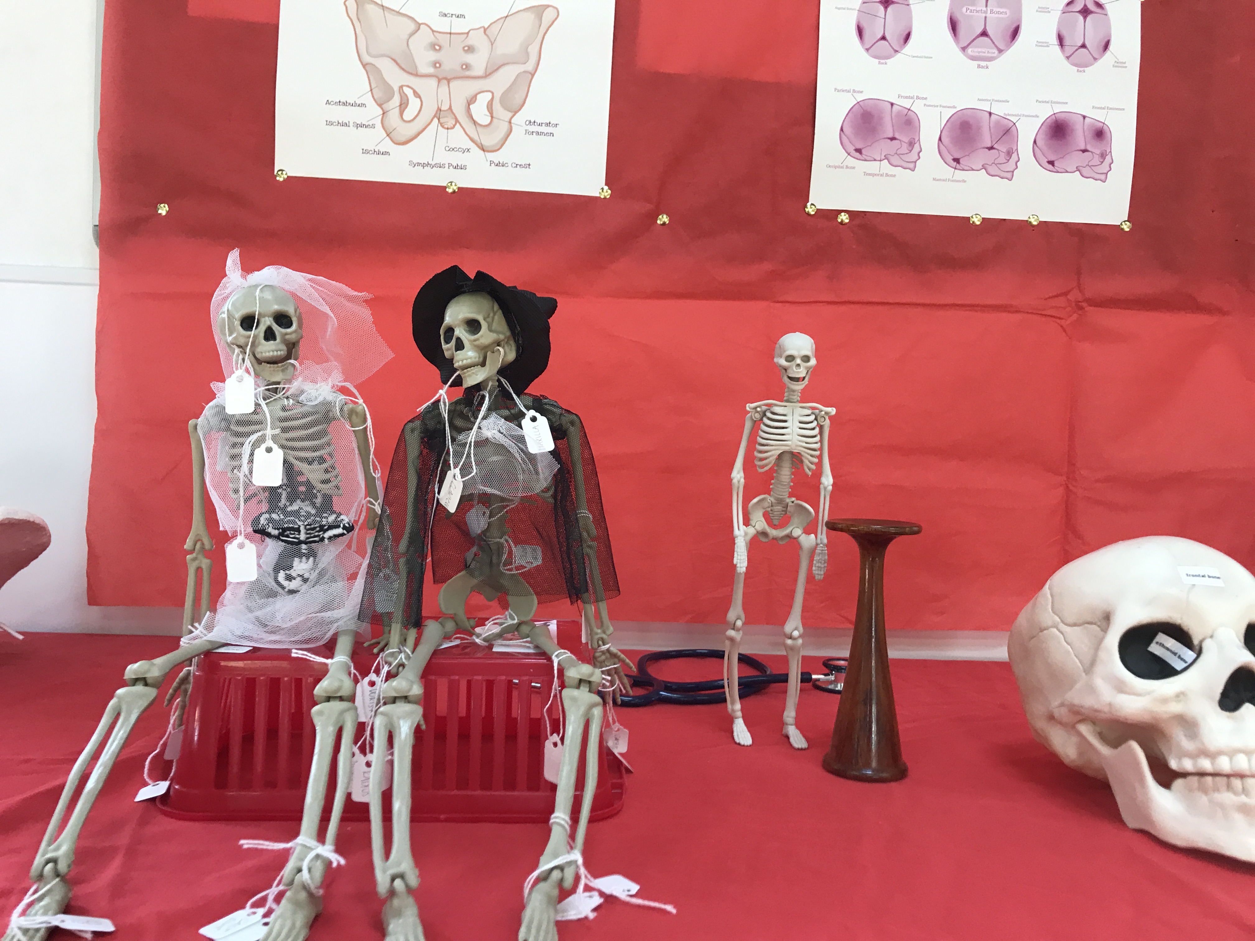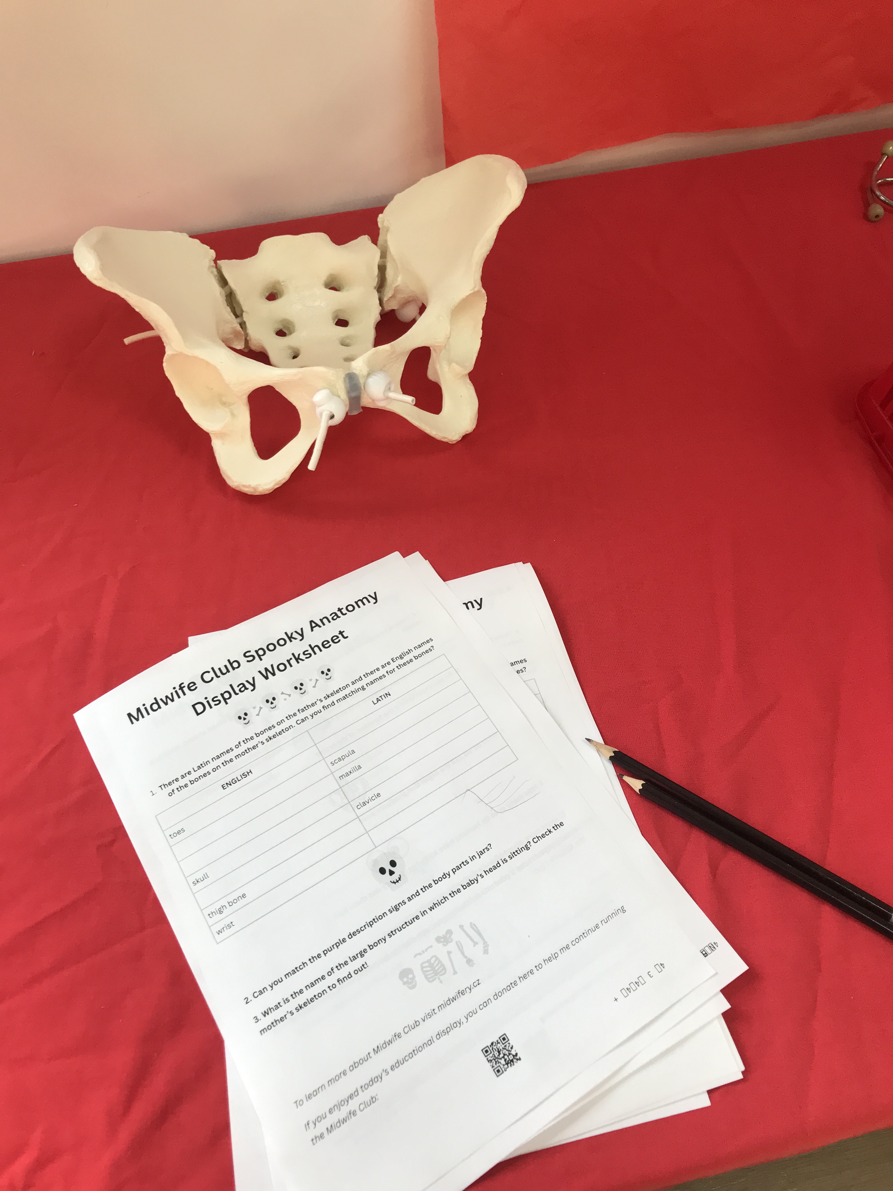 - 27/10/23 Spooky Halloween Anatomy Display. Pregnant mum and dad skeletons with bone name tags, skull with descriptions, female pelvis, body parts and organs matching game. Spooky anatomy display worksheets. Stethoscope and phonendoscope to play with. Spooky halloween music. Play and relaxation zone.