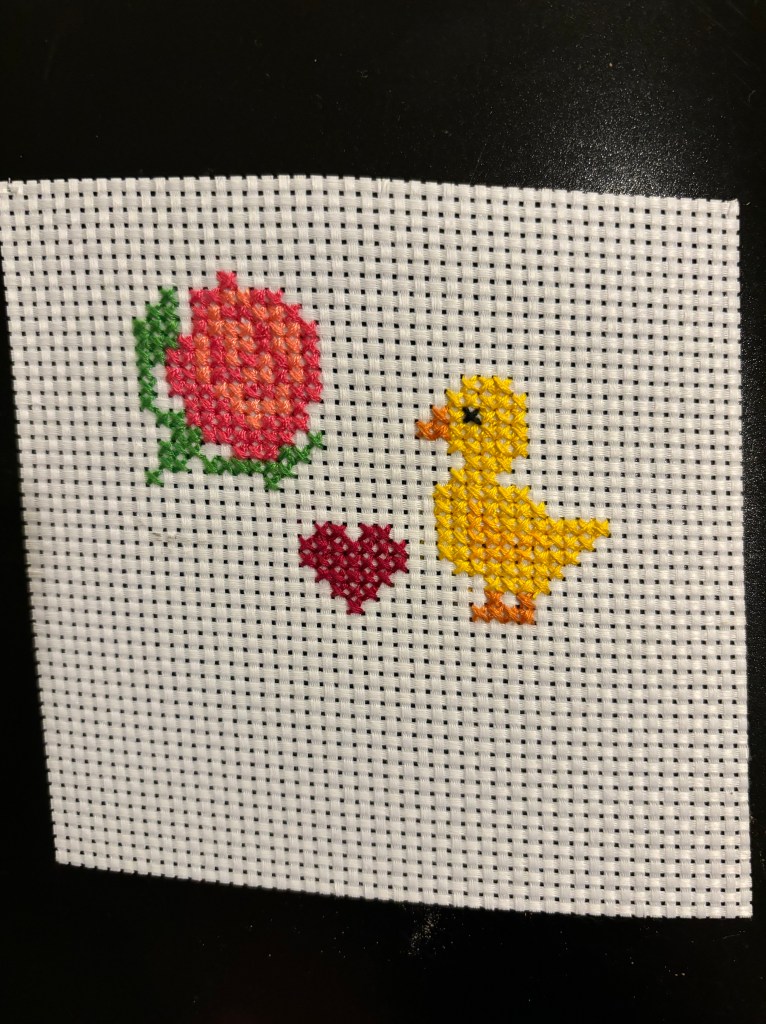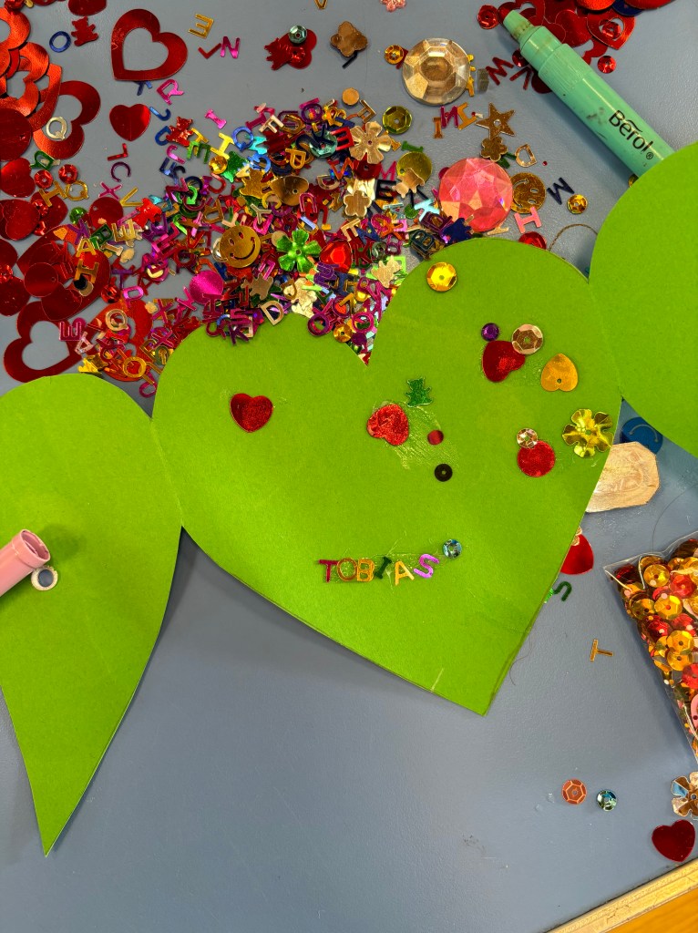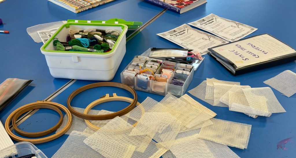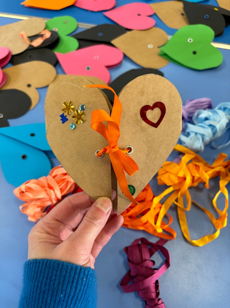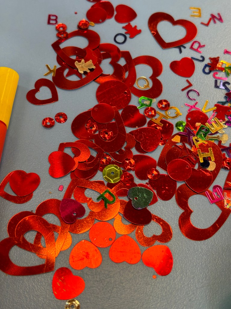 02/02/24 Baby dolls and accessories. Baby zone with various baby toys. Cross Stitch Project, week three. Decorating heart shaped cards for Valentine’s day at the main craft table.